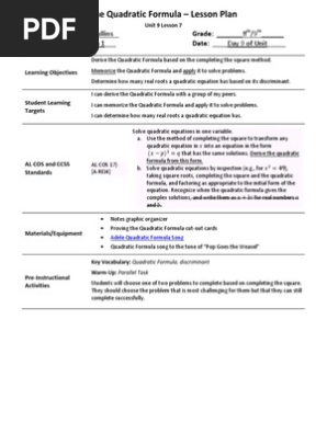 U9l7 The Quadratic Formula Lesson Plan Quadratic