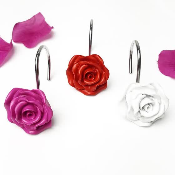 Silynew Shower Curtain Hooks Home Decorative Rustproof Shower Curtain Hooks Resin Rose Flower Shower Hooks Rings For Bathroom Shower Rods Curtains
